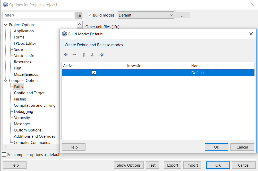 • ในส่วนของ Compiler Option หน้า Path ให้กด 2 ปุ่มตามภาพข้างล่าง จะทำให้มีโหมดในการ Run เพิ่มขึ้นมา ในส่วนนี้ การใช้โหมด Release จะทำให้ไฟล์ .exe ของเรามีขนาดเล็ก ช่วยประหยัดพื้นที่ได้อีกมากมาย